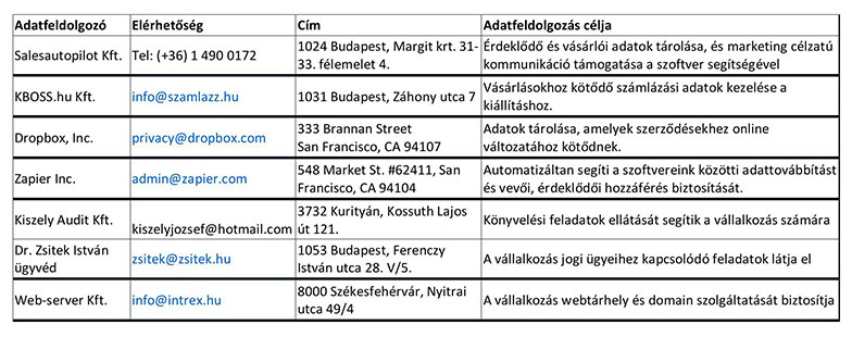 Megbízott adatfeldolgozók, elérhetőségük és a megbízásuk célja